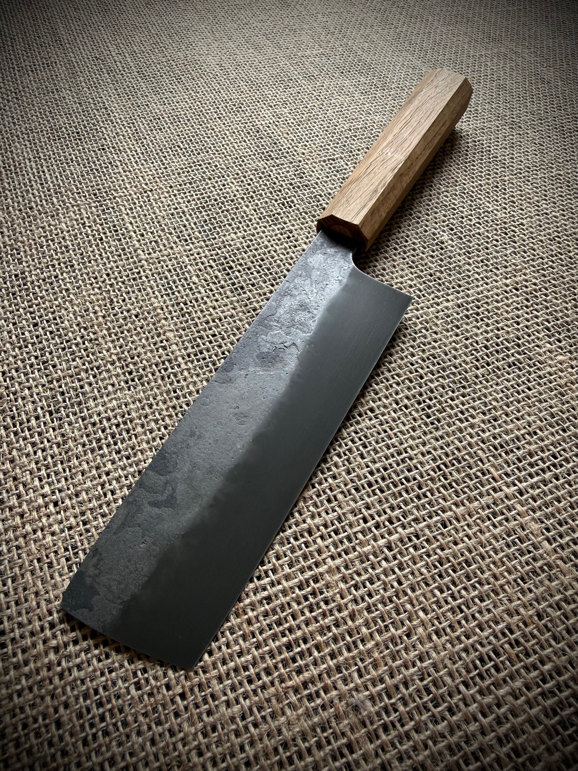 Made from British 52100 carbon steel. This Nakiri features a forged distal taper with a brute de forge finish and a dark etch to give it a stealthy appearance. The spine and choil have been rounded to ensure comfort whilst using the pinch grip. The octagonal handle was sculpted from a beautiful piece of locally and sustainably sourced oak. All of our handles are finished with a food safe mineral oil and beeswax to protect the natural wood.